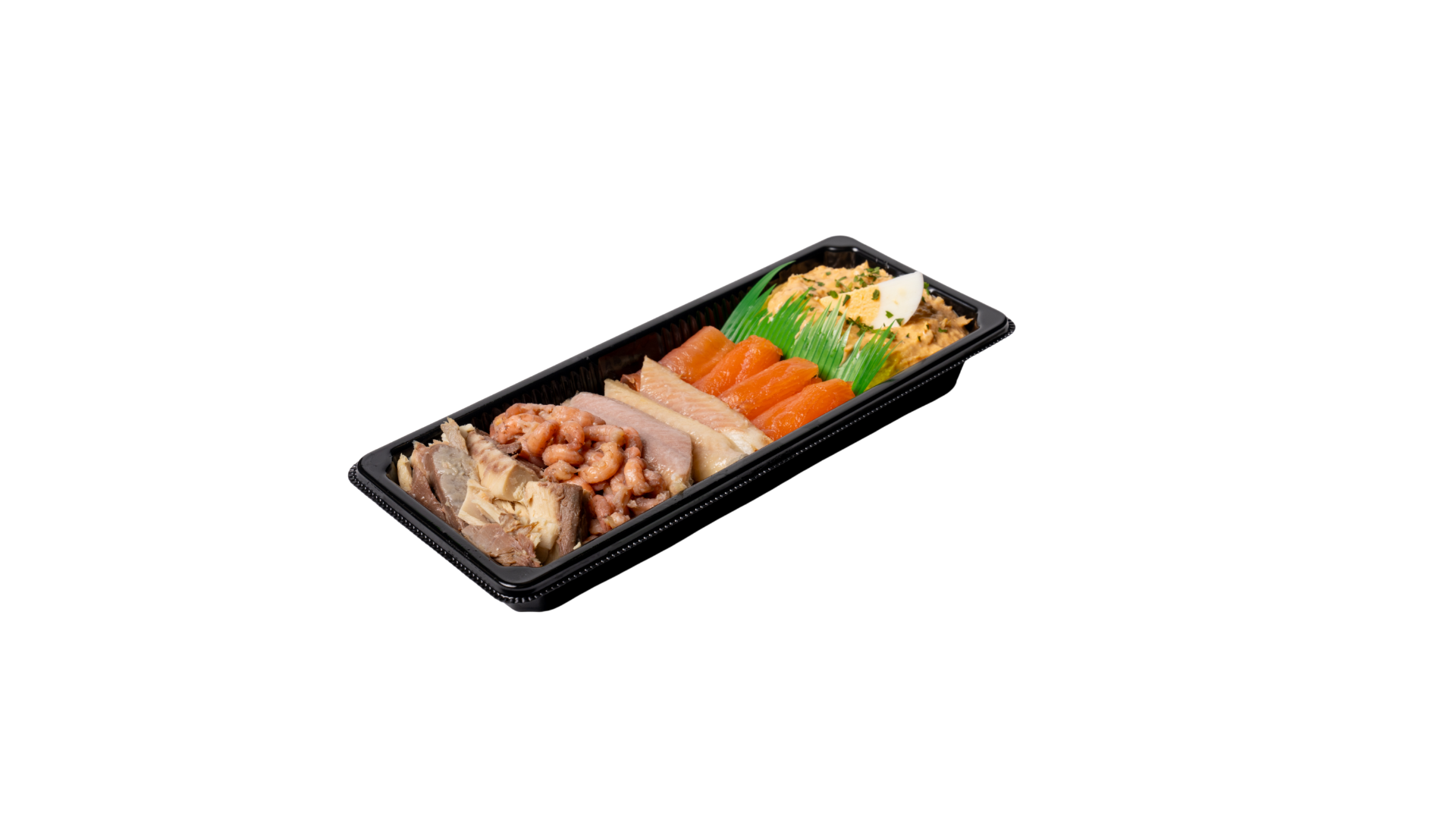 Een combinatie van: pure zalmsalade, gerookte zalm, paling, garnaaltjes en makreelfilet.